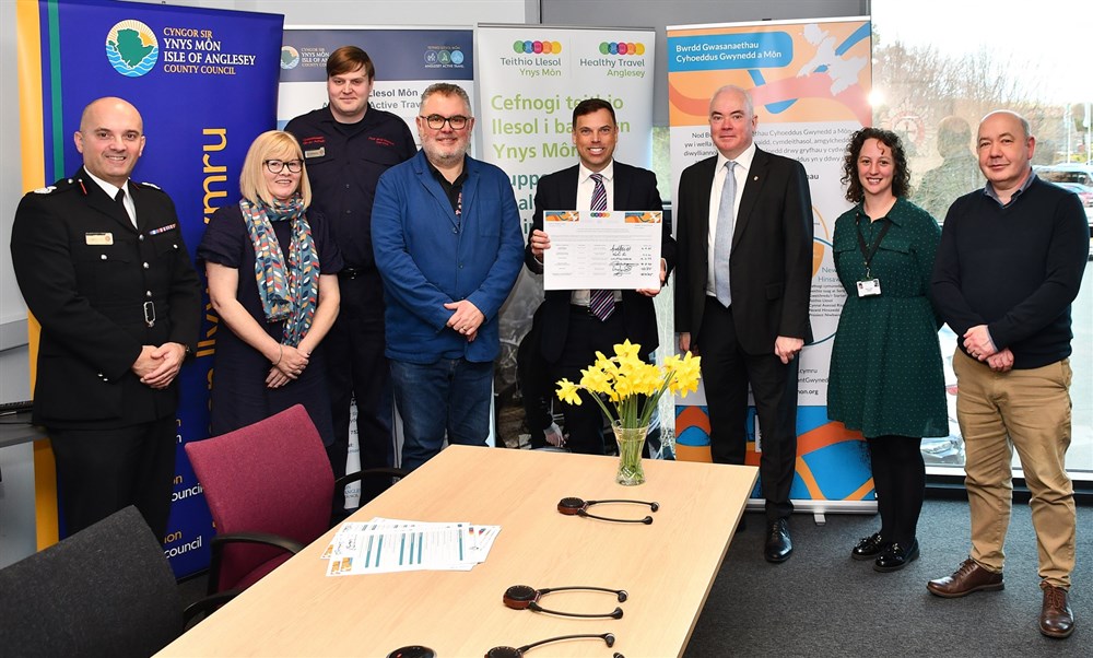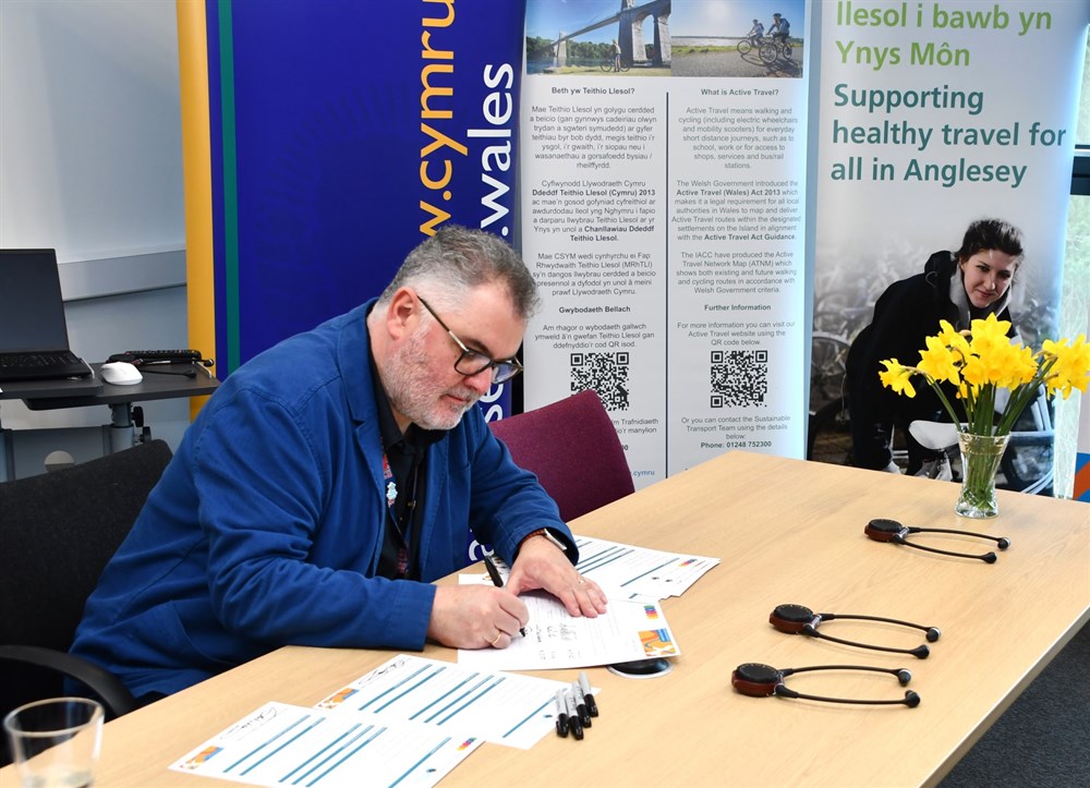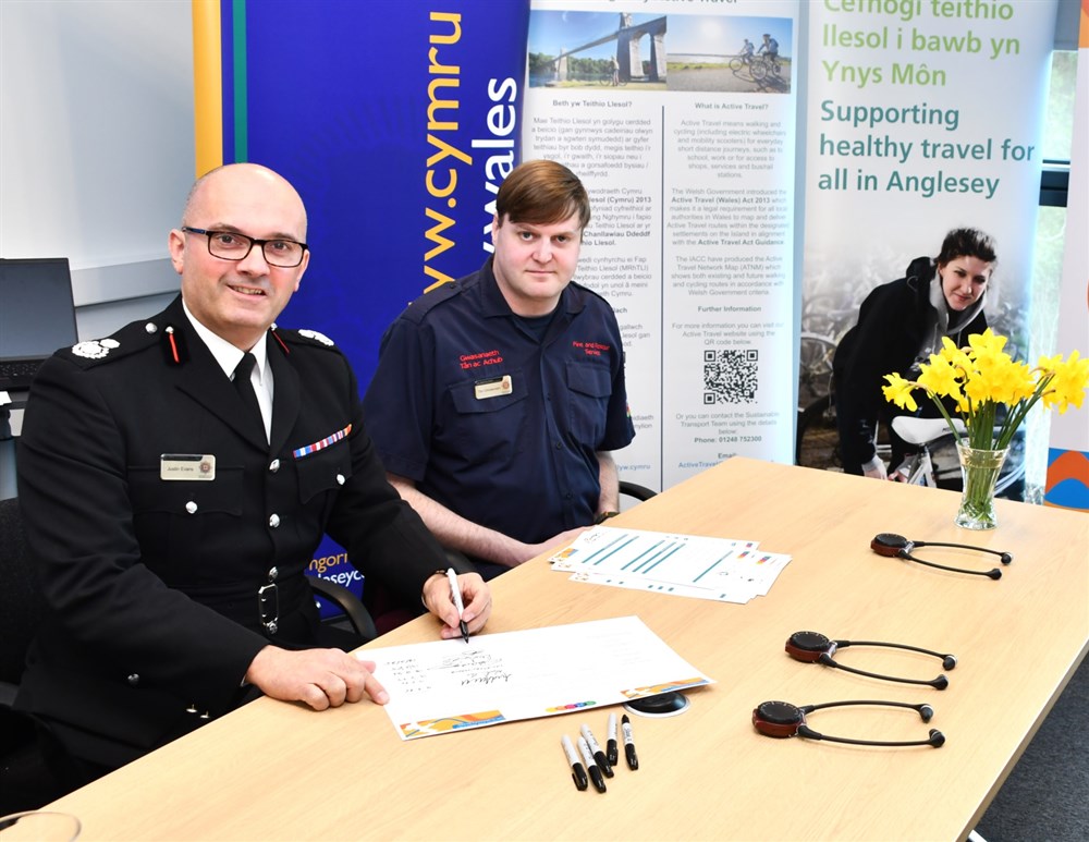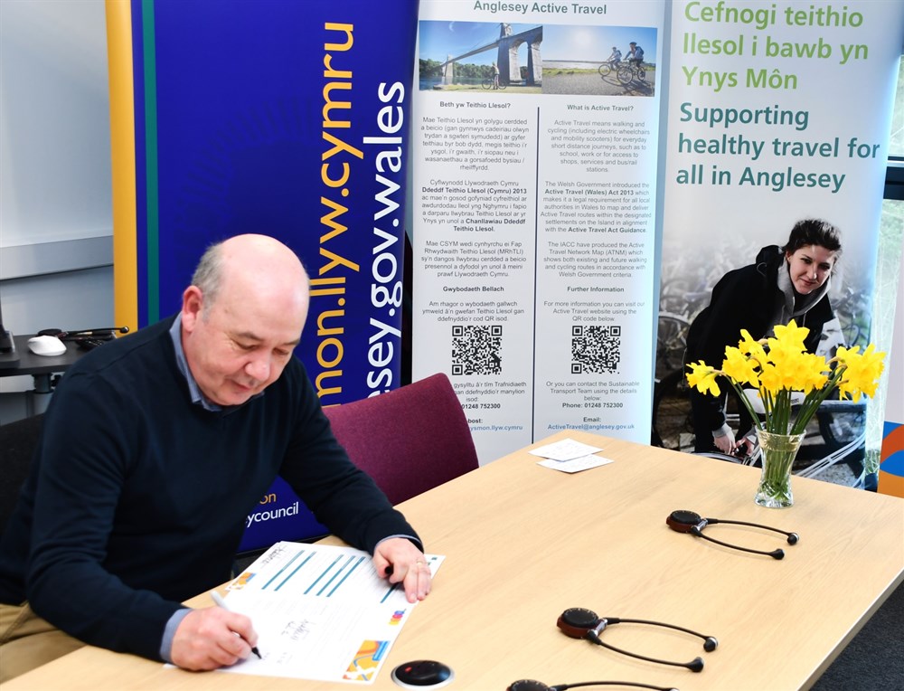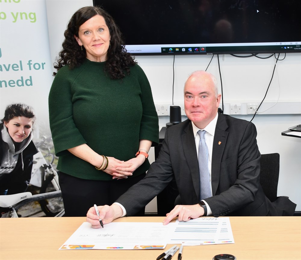 Mewn digwyddiad arbennig yng nghwmni Ken Skates, Ysgrifennydd Cabinet dros Trafnidiaeth a Gogledd Cymru, cyd-arwyddwyd Siarter Teithio Llesol ar gyfer y ddwy sir.