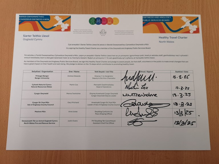“Wrth gychwyn ar y siwrnai yma, rydym yn edrych ymlaen yn eiddgar i rhagor o aelodau’r Bwrdd ymuno ac arwyddo’r Siarter, fel bod sefydliadau cyhoeddus Gwynedd a Môn yn gwneud eu rhan i wneud gwahaniaeth a lleihau’r allyriadau carbon a hyrwyddo’r buddiannau sylweddol i iechyd staff, y cyhoedd a’r blaned.”